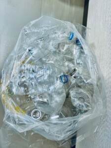 集積所に出す場合は、ラベル・キャップ・ボトルを分別してボトルのみをプラスチック製容器包装の指定袋に入れて出して下さい。